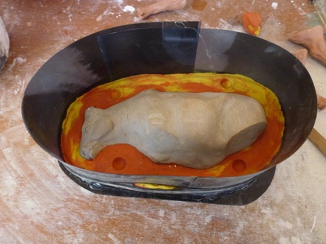 5-Encima del cliché y sobre una cama de plastilina colocamos la pieza tapando hasta la mitad marcada con el lápiz.