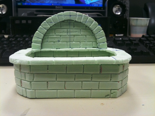 ...yo....le añadiría más pared a la parte trasera, para fuera más "lógica" esa proporción respecto de la propia fuente, resaltaría más así...pero, buen empiece el tuyo, ¡ánimo¡.