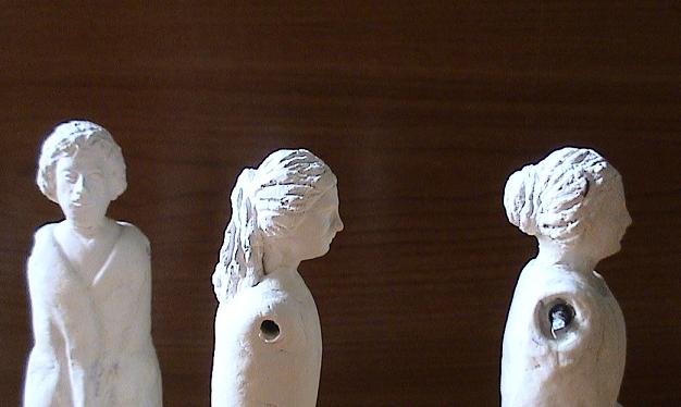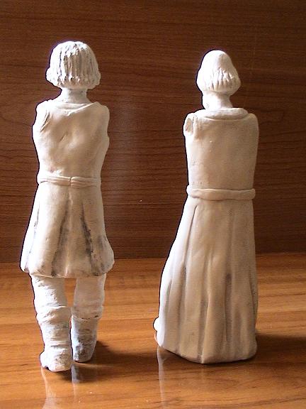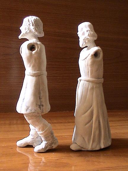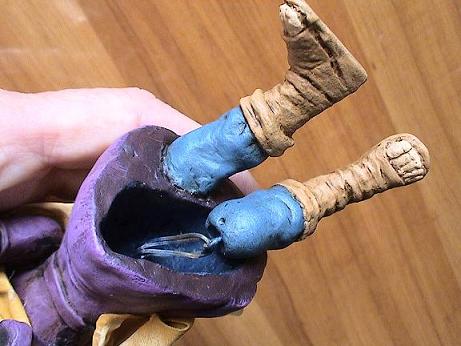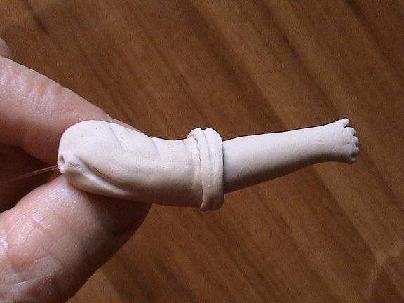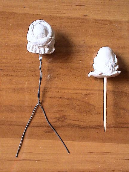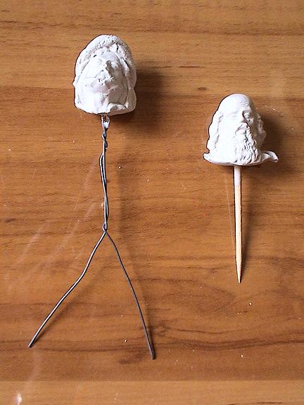 Al hacer el molde, meto un alambre doblado en la cabeza, antes de que endurezca. Este sujetará después el cuerpo y las piernas. La parte del tronco la retuerzo un poco y separo las puntas, para las piernas.