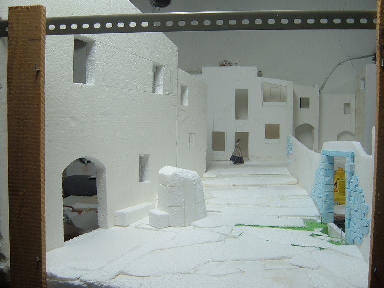 Tener en cuenta el ir aclarando los colores y disminuyendo la terminación irregular y rugosa de las edificaciones, piedras, montaña, puertas, tamaño de los arcos… así como el tamaño de las figuras y complementos, conforme los objetos se van alejando del espectador.
