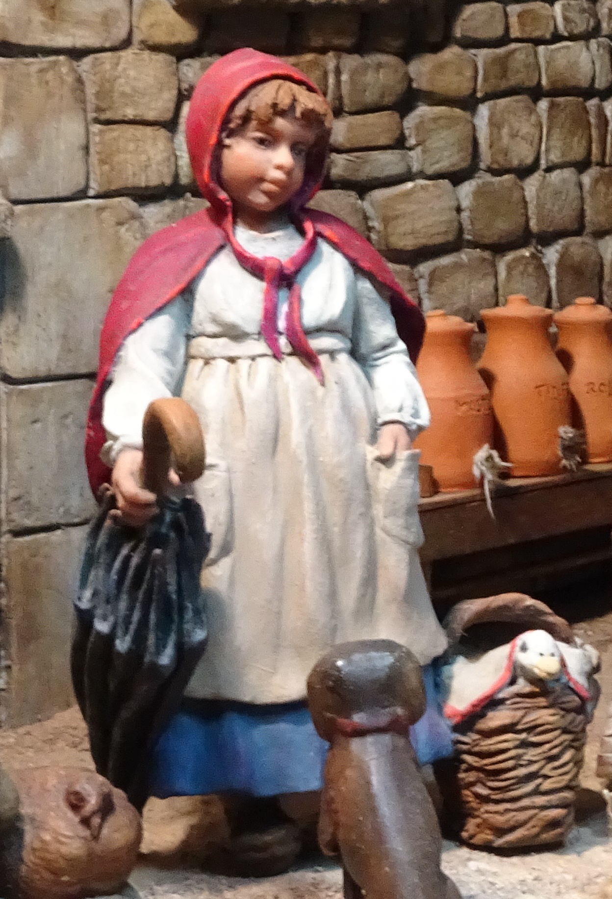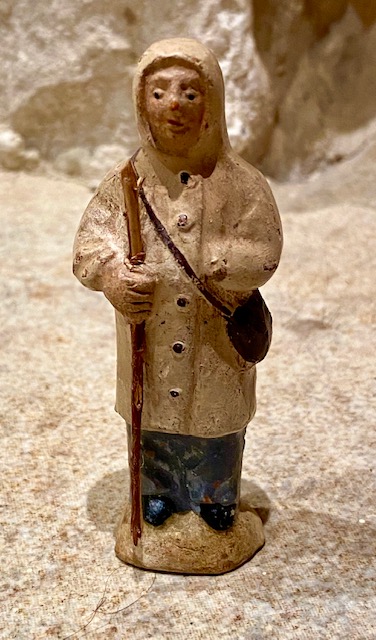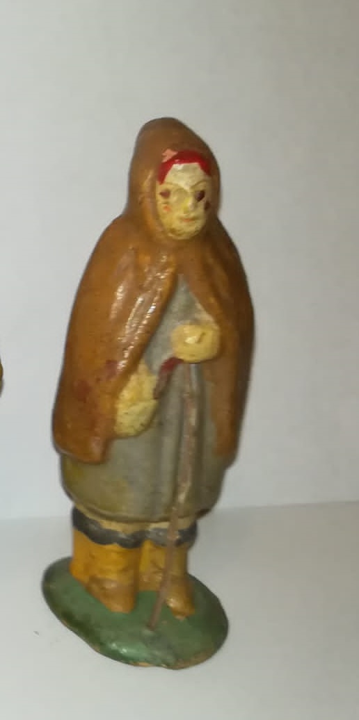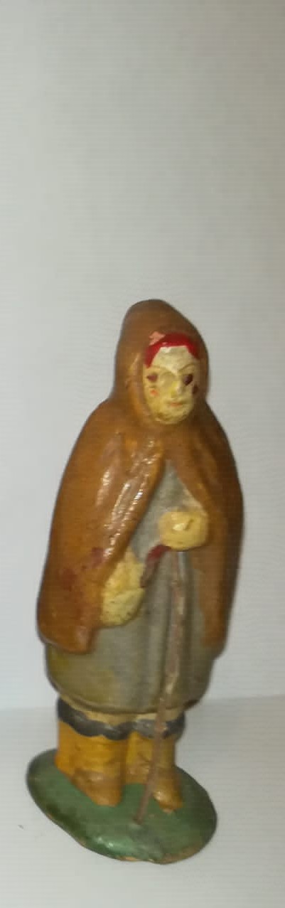 "una recolectora de setas del bosque", oficio o placer con posibilidad temporal pasada como actual y que cabría en cualquier belén. Dándole vueltas y retomando la de Ribes, podria ser y me gusta la de "Aprendiz" de algún oficio relacionado con la vestimenta, aparte de capa con capucha, en la mano no lleva un cayado de pastor, parece algun extraño instrumento (tipo tijeras o mejor imagino un recogedor de muestras, etc...). Tiene que ser relacionado con la tierra, la naturaleza para que llegue a ser un "arquetipo" tiene que sentirse que casi huela...¿quien recoge hierbas medicinales, setas, flores, del bosque/campo? y después hace preparados o unguentos para curas, antes no habían médicos como tal, tambien relacionado con lo "mágico" (podría ser una mujer que viviera en el bosque)...Aprendiz de sanadora/curandera o Chamán, versión actualizada aprendiz de herborista (herboristeria como ciencia tradicional actualizada) o de naturopata...