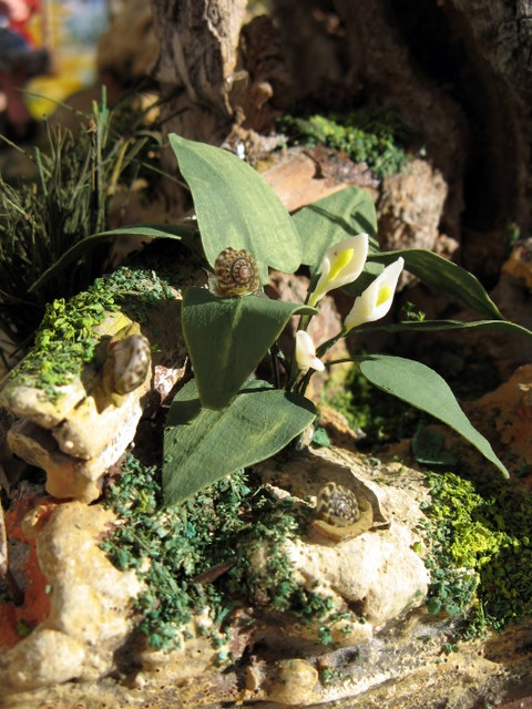 - En cuanto a las calas con flores, eso esta más elavorado. Las hojas se hacen como las hojas de las palmeras, con un alambre enmedio y con cinta de carrocero pegada por los dos lados, se recortan con la forma adecuada y se pintan. Las flores de las calas estan hechas a mano por una amiga mía que me las hace con maicena.