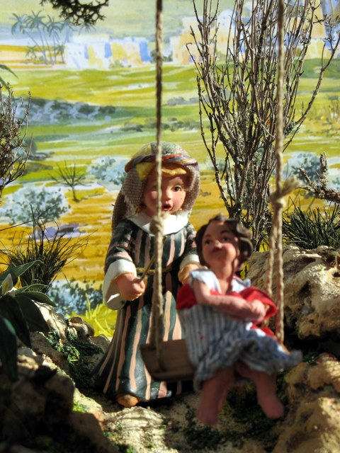La verdad es que son figuras de los chinos. Como es complicado encontrar niños para el belen, compre estas figuritas. La niña mayor era una hada, el mediano un monaguillo y los pequeños dos angelitos dorados encima de una bola. Total que tuve que tunearlos a los cuatro. Vestirlos y pintarlos de nuevo, incluso al del columpio lo tuve que romper en trocitos y componerlo como pude. Pero tienes toda la razón hay que darles un poco de "Rayos uva", para ponerlos morenos.
