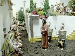 En cuanto a las figuras, la mayoría son de Jose Mayo Lebrija. el grupo de la coronación y mofa de Cristo es un conjunto hecho a palillo por un escultor de Puente Genil, amiguete mio, que además de tallar magistralmetne la madera y hecer unas imagenes sobervias, tambien hace figuras en barro tanto de Nacinmientos como de Pasión, se llama Pedro Garcia, es licenciado en -bellas Artes y actualemnte imparte clases en un instituo de Baeza (Jaén). Es muy bueno y las hace por encargo, claro está. El Jesús del beso de Judas es de marmolina y policromado por mi y el que hace de Judas es un San José muricano al que le puse un turbante y lo camufle. El resto de los personajes secundarios son murcianos, de los que uso en las escenas del Belén de Navidad.