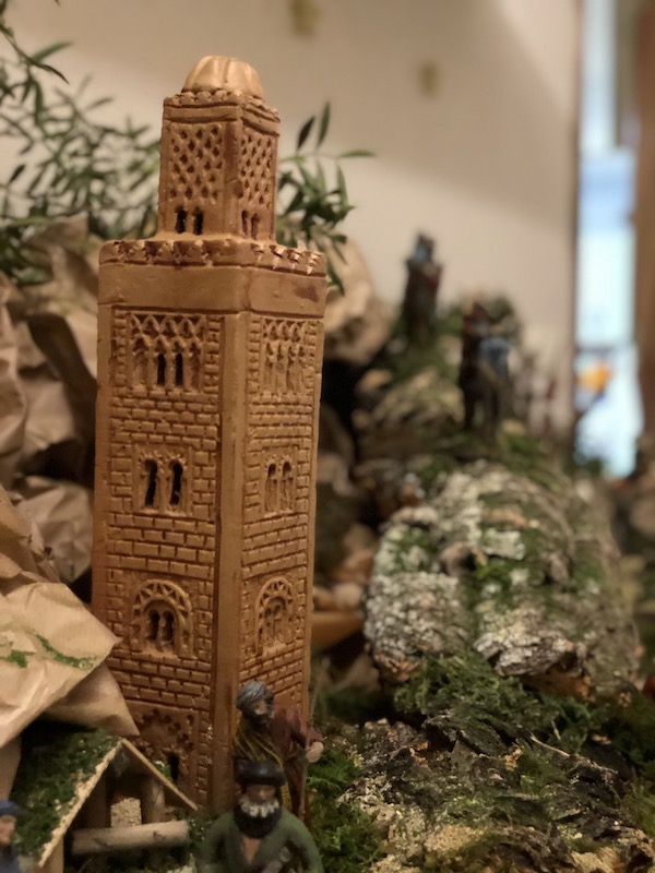 Una licencia arquitectónica anacrónica, una reporducción de la Mezquita Kutubiya de Marrakech, que centra la composición.