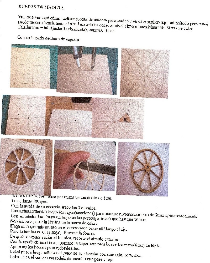 Lo Cortas con el cuter o cuchillo afilado (parte exterior) (ojo no te cortes) y lo vacias con soldador (parte interior) y luego lijas. Repites la operación y ya tienes dos ruedas. los travesaños, se hacen pegando varillas de éste material, algo redondeadas (8 travesaños en total)