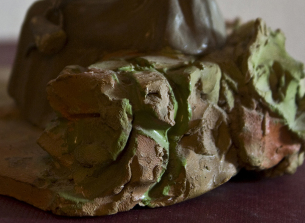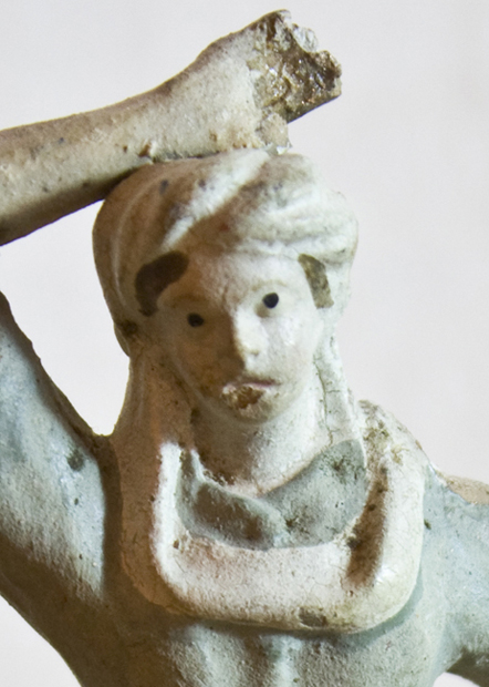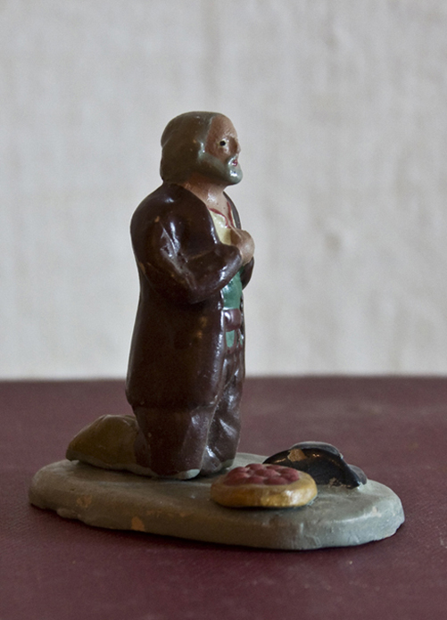 - pastor que degolla un corder lligat de les potes, mentre recull la sang en un rivell; a terra un sarró, la carbassa i un cistell en pans (20 cm d'alçada)