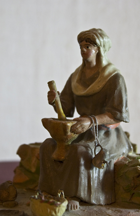 - dona sentada i amb el davantal tacat de sang, posa un rastre de baldanes a bullir a la caldera de coure (15 cm d'alçada)