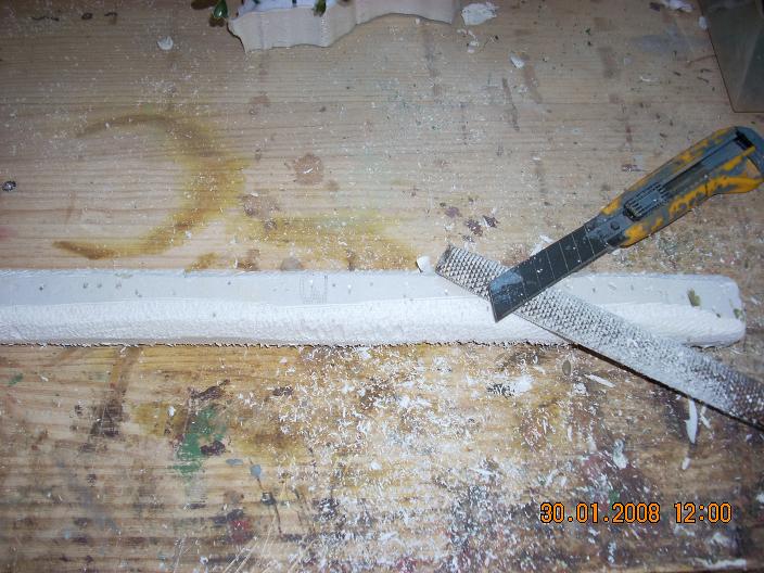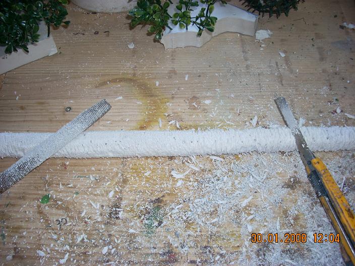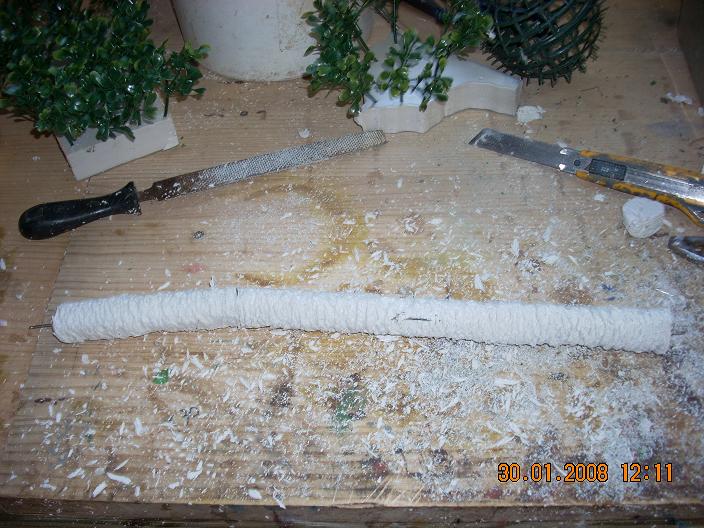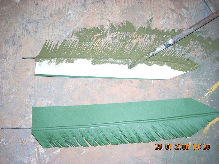Corto una tira de porexpan en cuadrado.- Le introduco un alambre lo mas grueso que pueda, en el caso de que no me entre por un lado lo hago por los dos y le saco punta dandole cortes sesgados y con el alicate le voy dando vueltas.- Al porexpanl e corto las esquinas y limo con una escofina de carpintero haciendola redonda.- Con el cutex de canto lo raspo de arriba abajo dandole forma como si fueran cortes de poda de ramas.- Pinto y le coloco una base que tenga algo de peso pasa que no se caiga.- Las hojas las hago con cinta de carrocero para asi no tener que andar con cola, coloco la cinta de carrocero, un alambre por medio y encima la cartulina, le paso la uña por el alambre para marcar,. Corto la forma de la hoja y luego le doy tantos cortes como me agrade para hacer las hojitas en forma de peine. Anteriormente las pinto en el verde que me agrade.- Una vez secas las voy pinchando en el tronco y les doy silicona caliente al alambre antes de pinchar, a continuacion las voy abriendo a gusto de cada uno.-