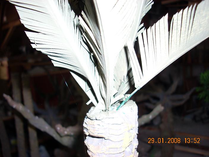 Los datiles los hago con alambre encolado y pegando granos de arroz, una vez secos los pinto y pincho en el tronco de la palmera .