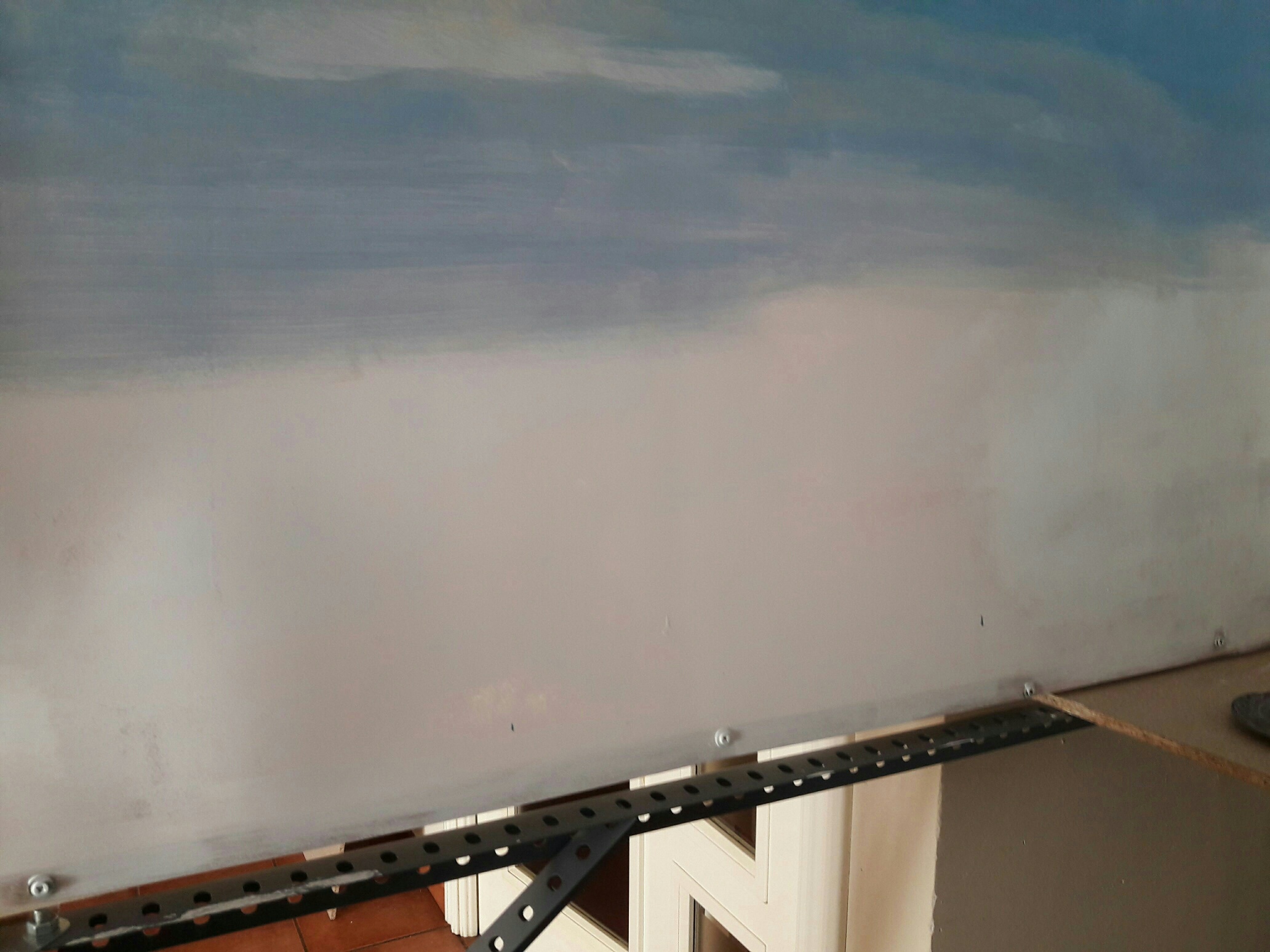 También mi forma de hacer el cielo con PVC rígido transparente de 0,75 mm de grosor, 100 cm de altura y el largo que se quiera puesto que viene en rollos de 5000 cm. Una capa de imprimación universal y colores acrílicos al agua, azul luminoso, azul cielo y arena, más oscuros arriba y más claros abajo, con rodillo y brocha incluso para las nubes.