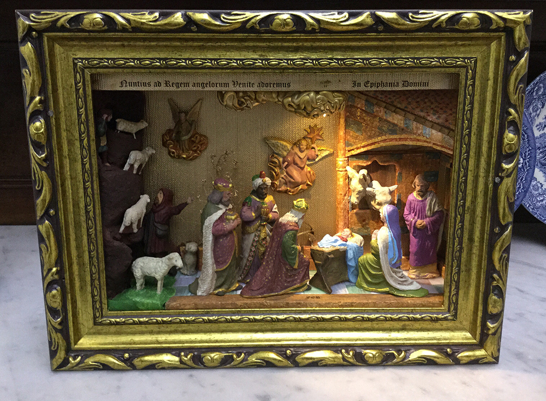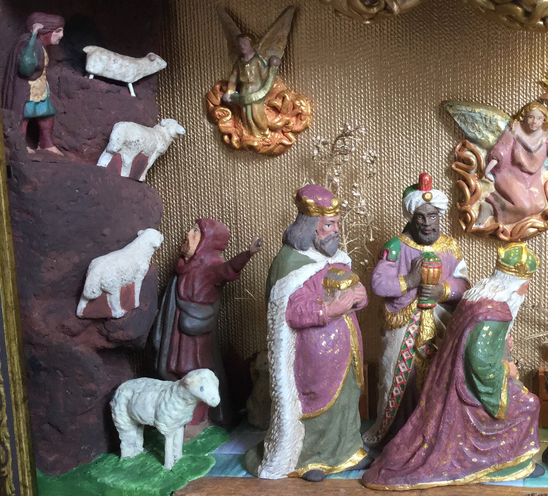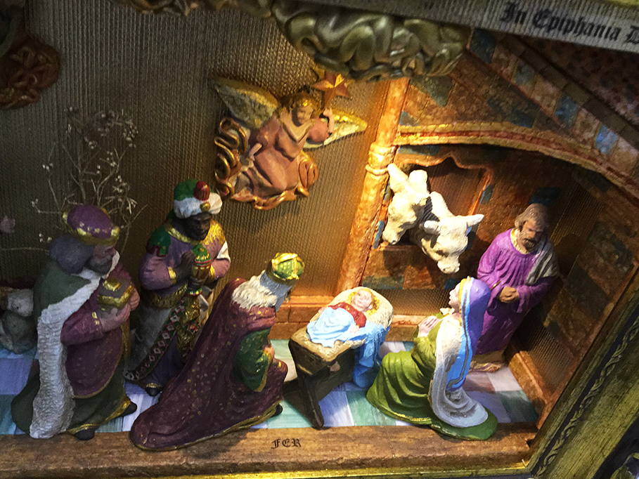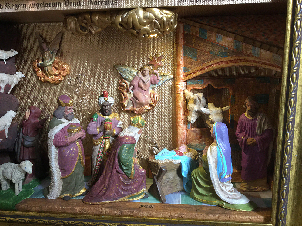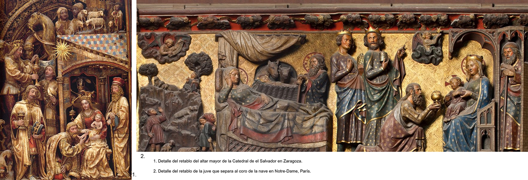 La escena seria la Epifania y al ser las figuras principales (Jesús, María y Jose con los Reyes adorando) con ese estilo, busque inspiración en dos retablos de resonancia parecidos, como el del altar mayor de La Seo de Zaragoza y el de la jube de Notre-Dame de Paris: