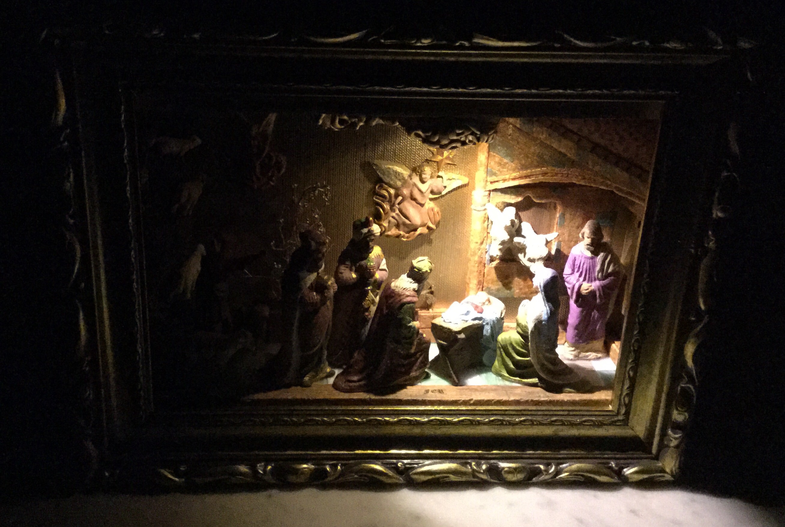 Y con unas figuras de escayola de 10cm de estilo "gótico medieval" sin pintar (que tenia arrinconadas), la base de una caja de madera, un marco dorado de los chinos y papel para empapelar paredes de color plata, he hecho un diorama para regalar a unos amigos.