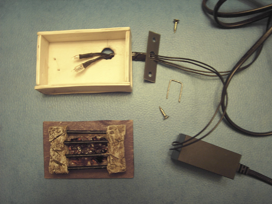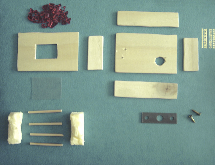 Tablas de cajas de fruta, palito de brochetas, porexpan de alta densidad, cristales rojos de un faro de coche, lámina transparente de plástico, otra lámina too plastificada, dos tornillos, dos grapas, dos neones... uno de ellos de luz fija y el otro de luz intermitente, nogalina, pintura PEBEO CERAMIC nº 14 de color negro, pinturas acrílicas, masilla ADEFIX P5, cola blanca, pegamento tipo loctite, sellador adhesivo de silicona SELLACEYS, cinta aislante...