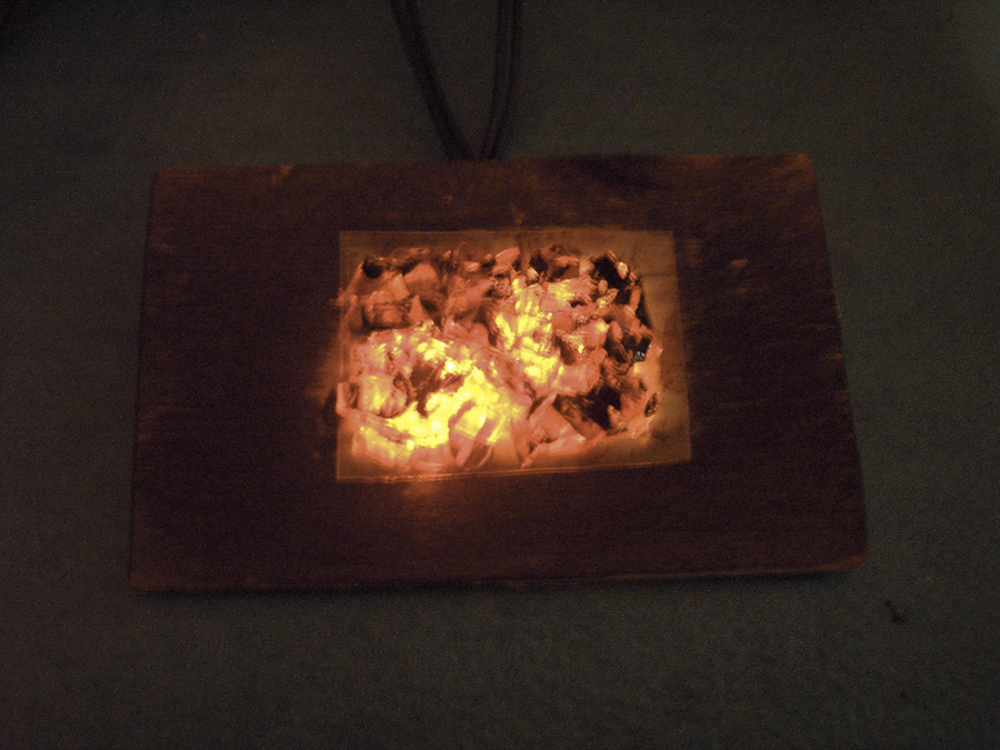 Cortar too el plástico transparente para obtener la lámina que necesitamos... encima de ella irán colocadas nuestras brasas y debajo de ellas los neones que las iluminarán... Pegar con loctite dicha lámina a la pieza de madera... teñir dicha pieza con nogalina... mejor antes del pegado para que adquiera mejor el color por todas partes... en mi caso se ven algunas marcas del loctite al haber hecho el tintado despues.