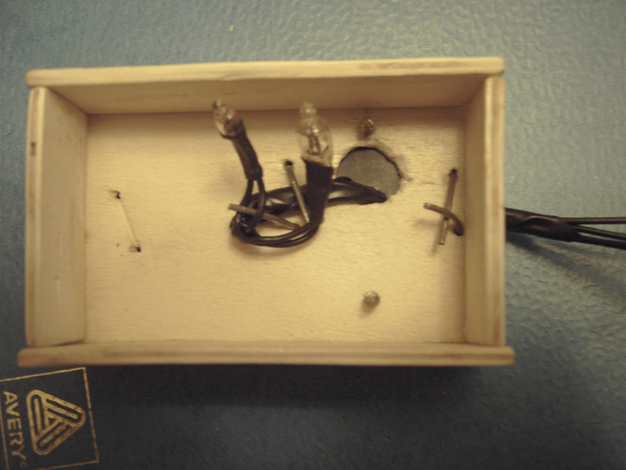 Too con el punzón marcaremos el lugar donde irán los tornillos de la placa de plástico externa de sujeción... Nótese que en dicha placa van introducidos totalmente los dos neones y los cables propios de ellos... antes de colocarlos definitivamente dentro del agujero de la caja y dentro de ella...