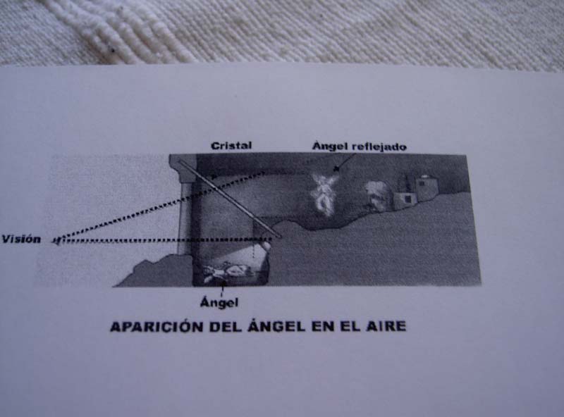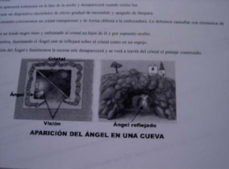 En la zona situada delante del cristal, y oculto a la vista del espectador por algœn elemento de construcción, colocaremos el ángel sobre un telón de fondo negro mate.