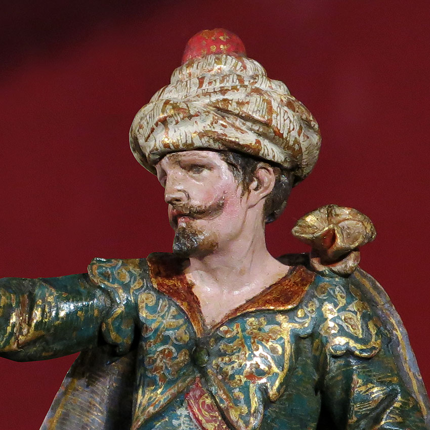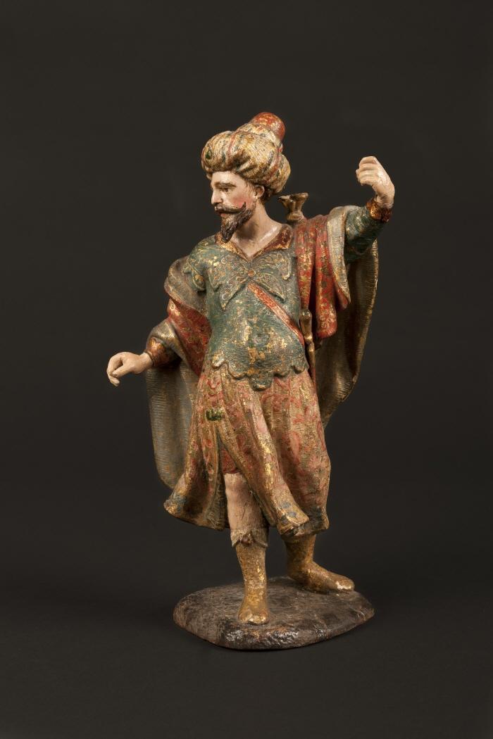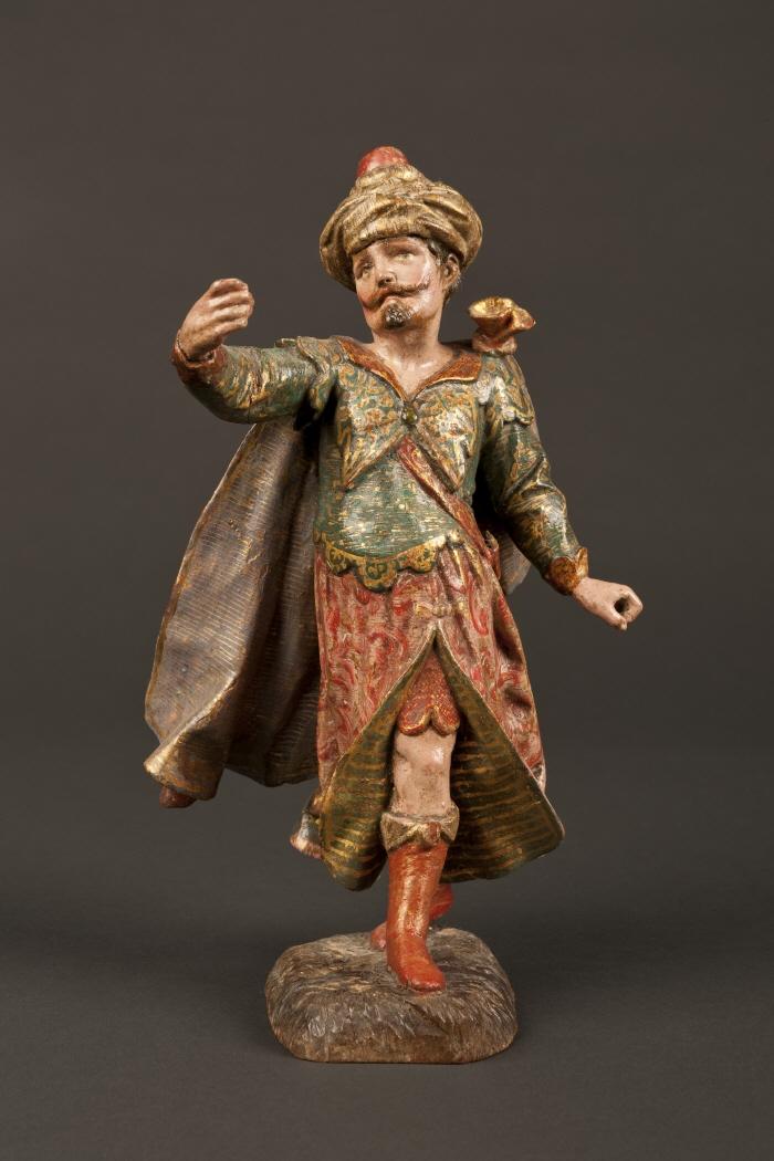 La moda de los miembros del cortejo de Gaspar (del que se desgraciadamente no se conserva al propio Rey) sigue una iconografía habitual en el siglo XVII, la vestimenta “a la turca”. Seguía modelos propios del siglo anterior en los que la presencia del “turco” era uno de los peligros acechantes de la monarquía española por el control del Mediterráneo. Por ese motivo se creó una estética de personajes que podían rayar lo grotesco, con largos bigotes y tez morena, que se acabaron convirtiendo en la estética habitual de sayones de las escenas de la Pasión de Cristo o, incluso, en receptores de golpes en muñecos fabricados para los ensayos de diferentes tornos y justas ecuestres, dando lugar al dicho popular de “ser cabeza de turco”. Sin esta concepción aparecen en el cortejo de los pajes del rey Gaspar, un nuevo contraste con los turbantes y capacetes cónicos del rey Baltasar, montado sobre un dromedario, que se acompaña por un heraldo y diferentes pajes a pie.