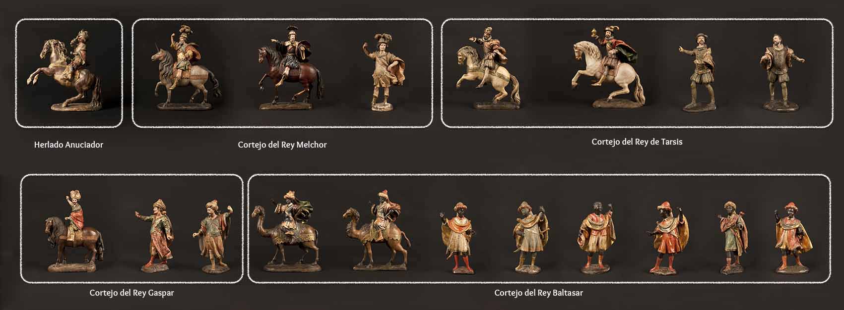 Aunque incompleto, hasta diecinueve integran una cabalgata de los Reyes Magos formada por piezas realizadas en madera de cedro policromada, con un tamaño que oscila entre los 20 y los 40 centímetros. Un rico conjunto que muestra una excelente variedad compositiva e iconográfica, con seis personajes montados a caballo, dos sobre camellos y el resto a pie, con la inclusión de fantasías propias de bestiarios medievales, como la presencia de un unicornio como medio de traslado de uno de los integrantes del cortejo.