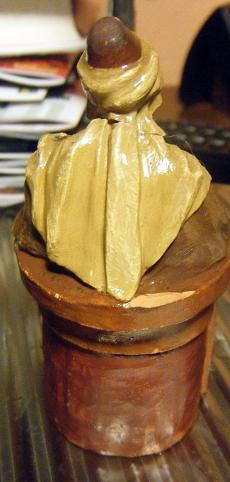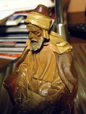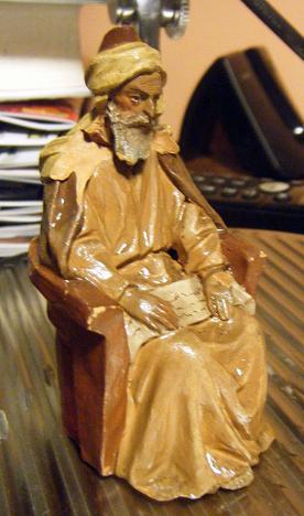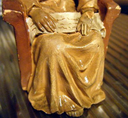 Un forero me ha hecho llegar esta preciosa figura de palillo de Martí Castells, un doctor de la Ley, para que lo restauren. Es una figura de 11 cm. bastante perjudicada, pero con un color precioso. En las fotos brilla pq le quité la porquería bajo el chorro de agua (funciona bien en figuras con la terracota bien cocida y colores sólidos) y no estaba totalmente seca. Me encanta el detalle de las escrituras en hebreo. Pongo las fotos pq en julio tendremos la restauración y podremos comparar, a ver cómo queda.