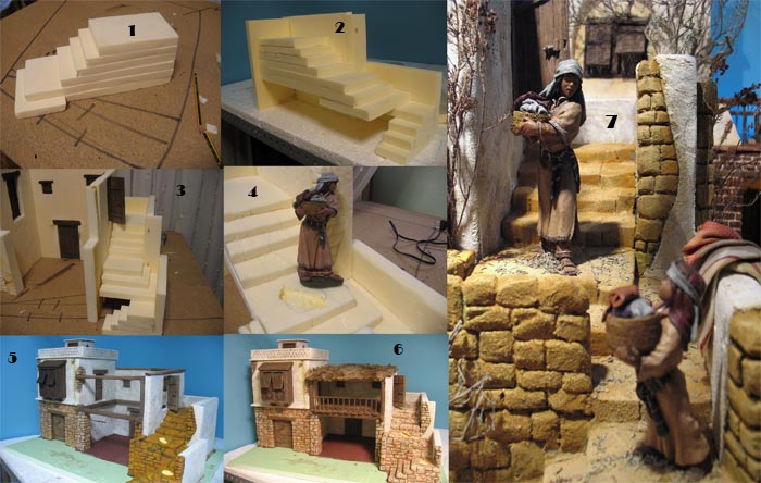 En esta foto esta resumido un paso a paso de otras escaleras ,solo depende del tamaño del escalón y le vas añadiendo planchas de porex ,y luego seguir el tallado y en este caso hacer hueco para la peana de las figuras ,pintar y listo ,alguna duda pregunta sin miedo ,pero una foto como te dice paquirri vendría bien para poder orientarte mejor .