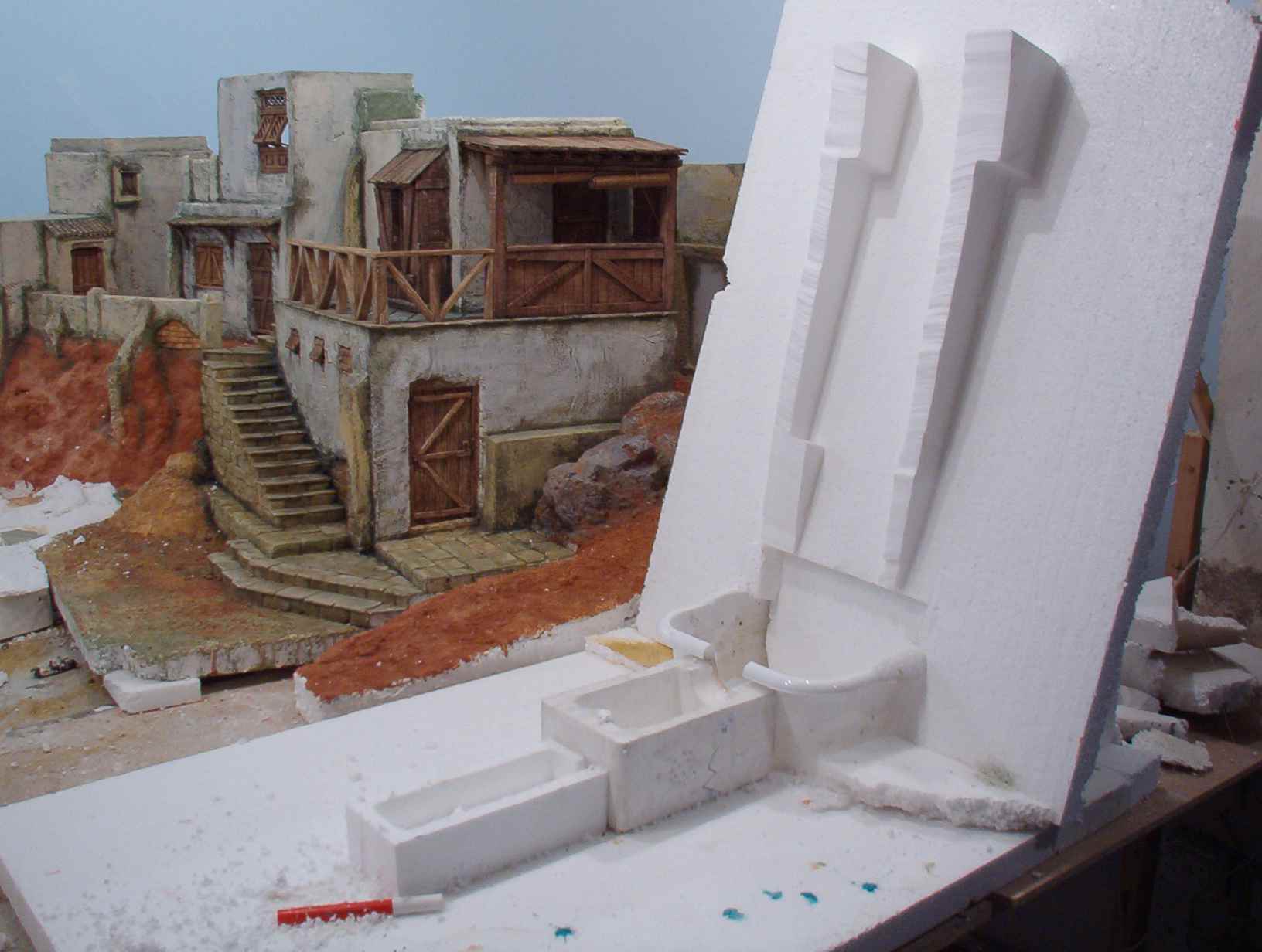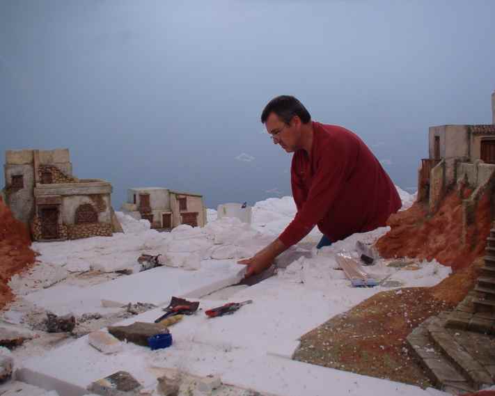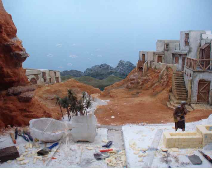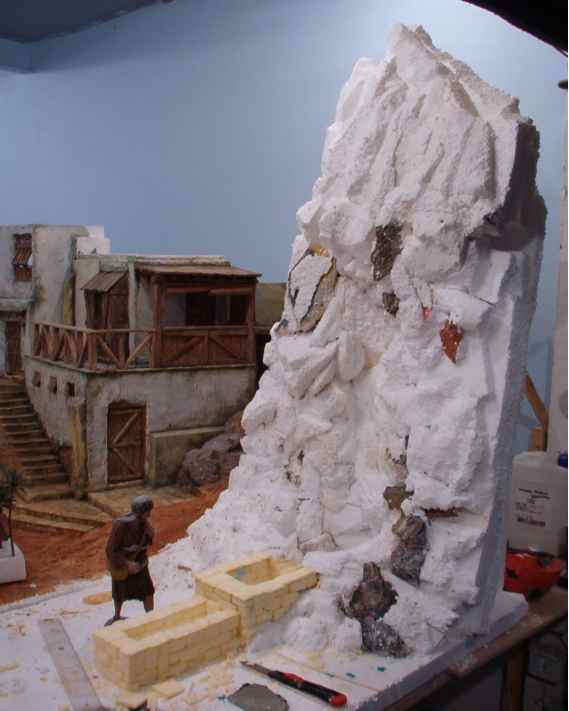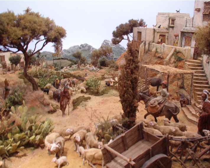 En mi mente, desde el primer corte de cutex, bullía lo que quería realizar, que fuera un homenaje a los belenes familiares que montaba junto a mi padre, con espacios abiertos donde hubiera mucha animación de gentes y animales, que tuviera vida y calor propios, buscando distintos planos y tamaños para crear la sensación de lejanía y profundidad.