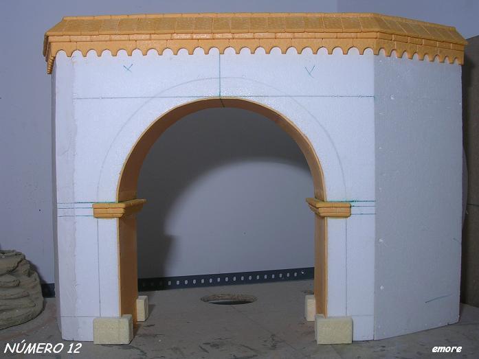 CONCA - 23/3/2010 14:43 En primer lugar GRACIAS y reitero mi más absoluta admiración por tu destreza. Es un auténtico placer ver tus obras. Son perfectas. Y ahora tengo un par de preguntas: - En la foto 3 se ve como entre los dos frontales del arco has puesto otro arco que une las dos partes donde luego vas pegando el pórex denso. ¿Qué material has utilizado, es madera de balsa o es pórex denso, de qué grosor en ambos casos? - ¿Cual es la altura del arco desde el suelo a la clave? Muchísimas gracias de nuevo.