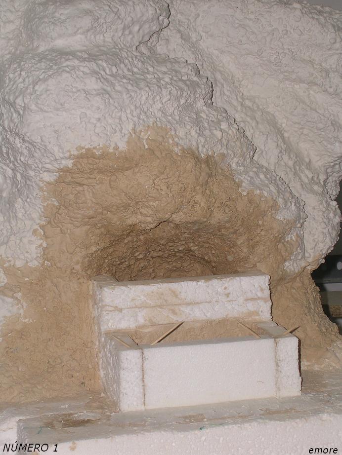 El interior del recipiente donde cae el agua está hecho con el mismo poliestireno expandido que he construido el montículo, con una buena capa de mortero para el sellado de juntas de color beige 172 (MORCEMCOLOR), foto número 12.