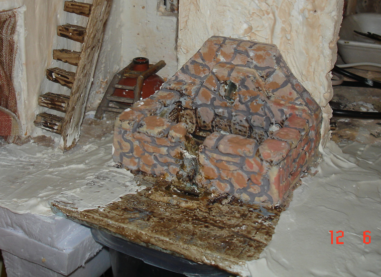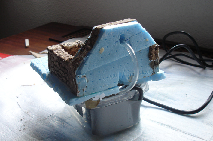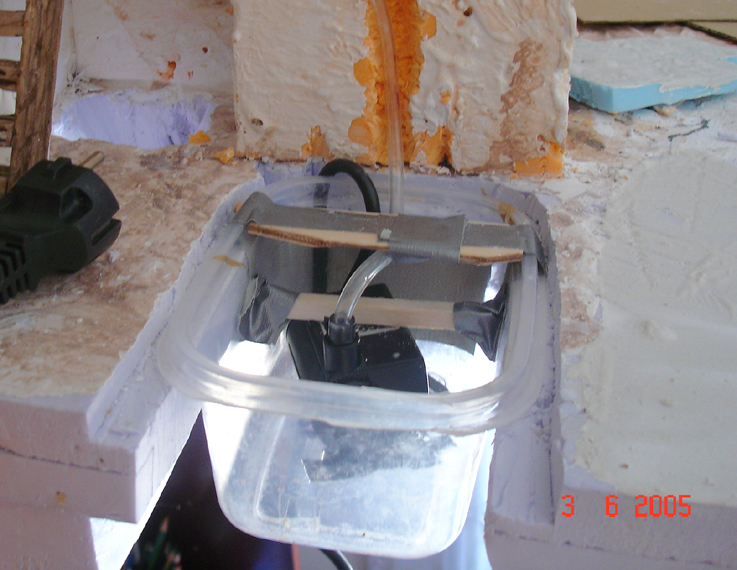 Por lo que cuentas tu intención es poner la botella cortada por la mitad ¿no?. Vale. Puedes revestirlo con escayola o mejor con cemento moreno y después aplicarle una pintura verde antihumedad (compra el bote pequeño, y así y todo, te sobrará). Una vez seca esta pintura, puedes darle la tonalidad que quieras.... otro método puede ser pegar en la pared pequeñas piedras con cola o incluso arena, porque si no es mucho tramo lo que tienes que disimular, por el asunto del coste, te saldrá más barato poner piedras o arena pegadas. Yo en cuanto a las fuentes hago lo siguiente: con un taper hago la base donde va a parar el agua y de donde vuelve a subir , sobre una pared, hago la decoración que quiero con porex y me las ingenio para que el agua nunca toque el porex pero que parezca que sí lo hace; el efecto lo puedes conseguir si poner la fuente de frente al espectador y en el fondo musgo, piedras..., el chorro del agua si lo abres en vez de que salga directamente de un tubo estrecho, te dará la sensación de cascada amplia y a los ojos del espectador que cae por la pared... pero si quieres que de verdad chorree por toda la botella, preocupate de impermeabilizar (más que nada por la humedad y la electricidad) y de que el cauce no tenga grietas... para ello, cemento moreno y pintura antihumedades.