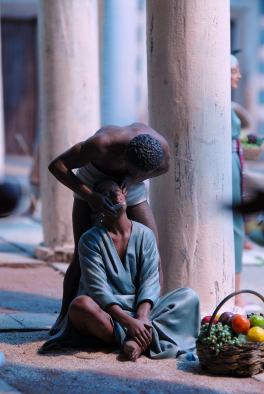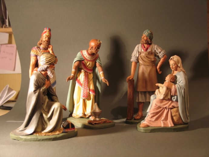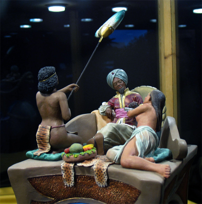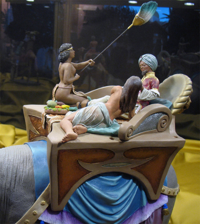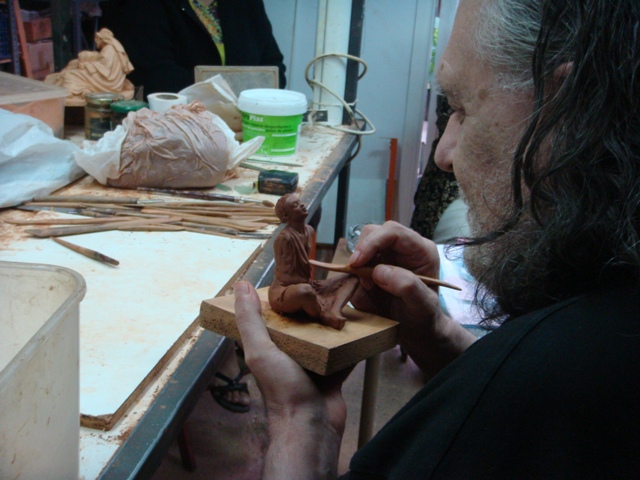 Su sistema de trabajo es muy sencillo: Viene alguien y le pide una figura, normalmente inspirada en algún cuadro, lámina o imagen, y él lo reproduce lo más fielmente que puede, siempre dentro de su estilo, muy característico, de figuras grandes, esbeltas, de largas piernas y atractivas... y con mujeres preciosas... lo que nos dio mucho que hablar el otro día en la exposición, sobre la experiencia del artista en el tema, pero no es cuestión de tratarlo por aquí .