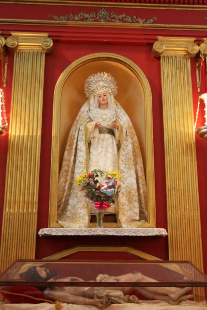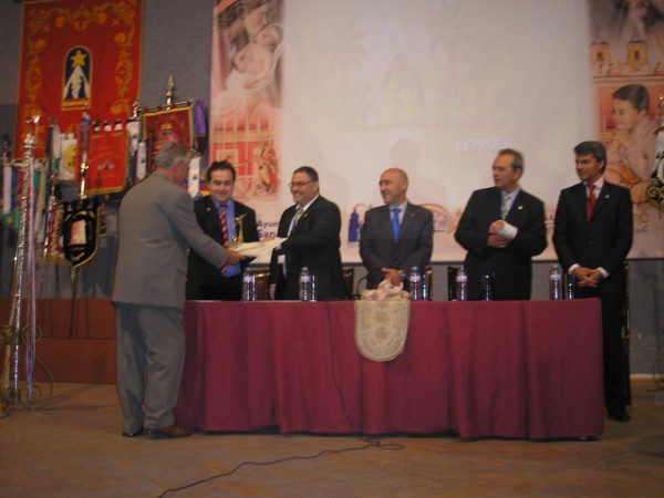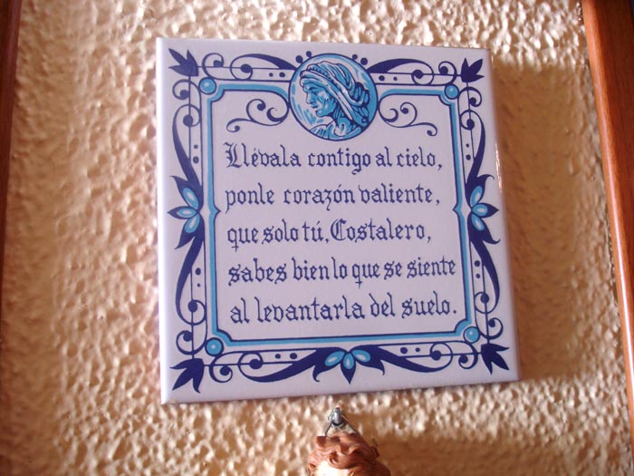 Finalmente, no podía faltar un recuerdo a la madre que pario nuestro Niño y que en Andalucía tiene su palacio, pues toda ella rezuma su dulzura maternal. Tuvimos en este Congreso varias ocasiones de verla en formas diversas y advocaciones variadas. Quiero recordar aquí una magnifica escultura de la Roldana y a la Virgen del Carmen. Y una particularidad, paralelo al belenismo, estaban las celebraciones de Semana Santa y sus Cofradías que, en una perfecta mezcla, convivían con el Belén, imbricadas unas en otras de tal forma, que como muestra sirva este botón de la foto nº 9 , recogido en casa de uno de los mejores belenistas de Isla, Coto :