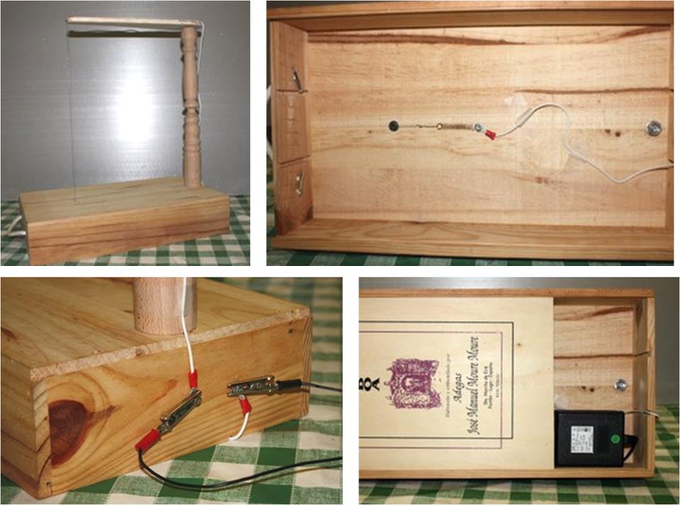 Como podéis ver está hecha con una caja de vino, una pata de taburete, el hilo de nicrom de un secador y un transformador de una impresora vieja.