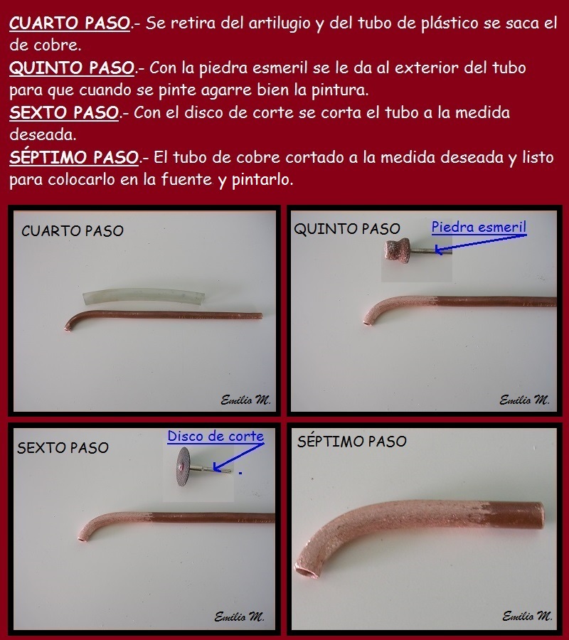 He observado en algunos belenes que utilizan tubo de cobre para la salida de agua de la fuente, que la curva de dicho tubo está aplastada. Así que por medios de fotos os voy a explicar cómo lo hago yo para que dicha curva no se aplaste.