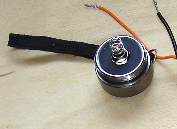 Es decir , el cable de dos hilos que se ve en la foto tiene uno de ellos doblado a 90º, en ángulo recto. Este es el que se introduce en el agujero de la patilla que se ve en la foto. Se dobla una vez pasado por el agujero y se suelda por el exterior de la patilla (la parte que no vemos).