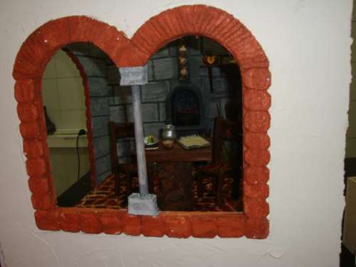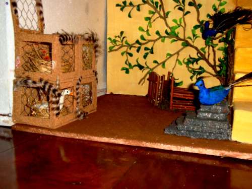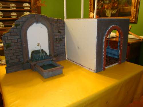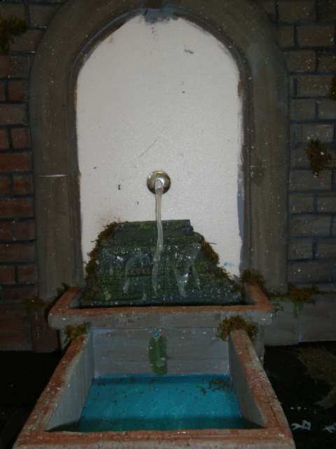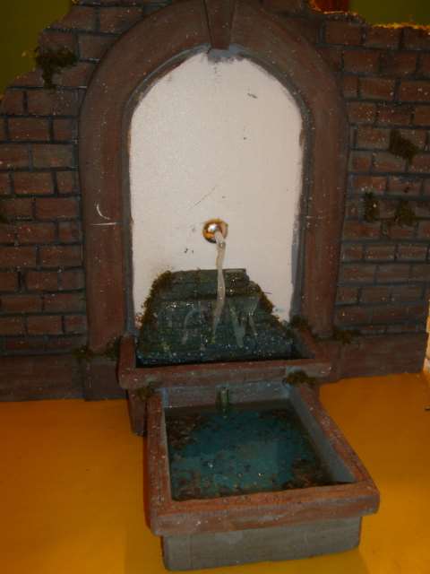 fuente 2- El chorro de agua está hecha con siliconas, el fondo lo pinté con acrílicos y para simular el agua llené el estanque con gel de parafina
