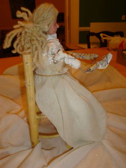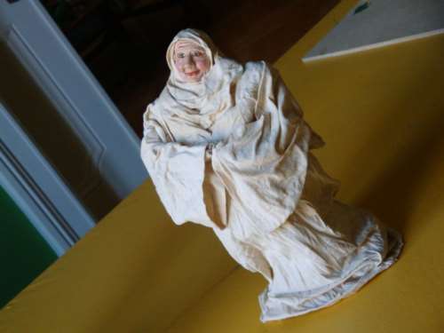 Abuela hecha con interior en alambre de gallinero y papel de diario.Los pies, las manos y la cabeza hechas con moldes en porcelana fría. El pelo es de lana natural de oveja y el vestido está hecho con liencillo