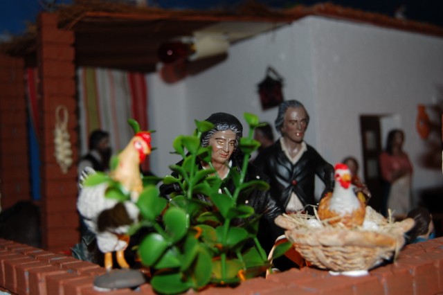 Título: Los abuelos. Ella cogiendo huevos y él con el pavo para celebrar la Navidad.